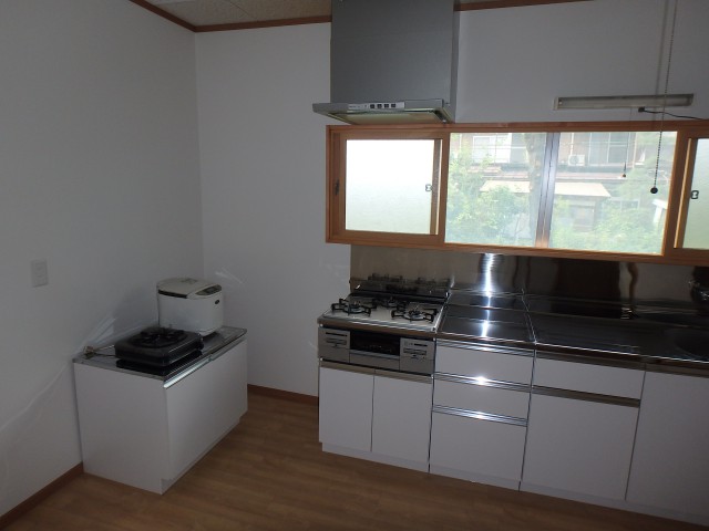 コンロは据え置き型ではなくビルトインタイプにし、レンジフードと連動出来るモデルに取替えを行いました。レンジフードは見た目もスリムでお手入れ簡単なモデルです。