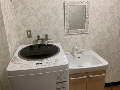 お嬢様の希望もあり、洗面台は化粧鏡なしとして、鏡は別途購入いただいたモザイクタイル柄フレームのものを取付けさせていただきました。